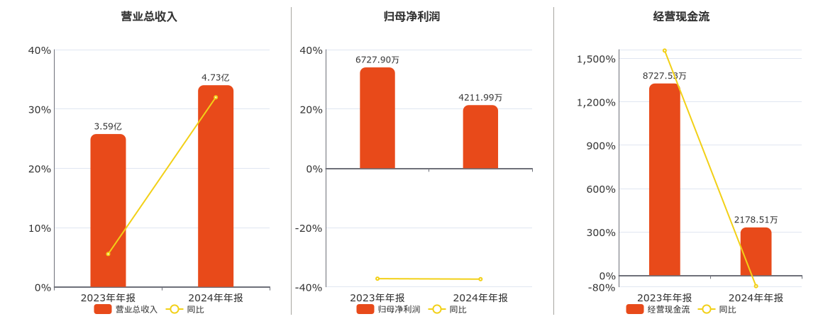 公司营业总收入为4.73亿元。归母净利润为4211.99万元,较去年同报告期归母净利润减少2515.91万元,同比较去年同期下降37.40%。经营活动现金净流入为2178.51万元,较去年同报告期经营活动现金净流入减少6549.02万元,同比较去年同期下降75.04%。