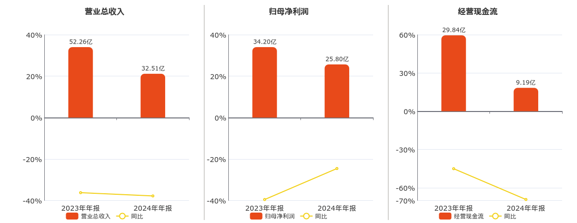 公司营业总收入为32.51亿元,较去年同报告期营业总收入减少19.75亿元,同比较去年同期下降37.79%。归母净利润为25.80亿元,较去年同报告期归母净利润减少8.40亿元,同比较去年同期下降24.56%。经营活动现金净流入为9.19亿元,较去年同报告期经营活动现金净流入减少20.65亿元,同比较去年同期下降69.20%。