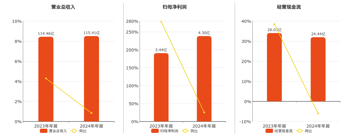 公司营业总收入为115.41亿元。归母净利润为4.30亿元。经营活动现金净流入为24.44亿元,较去年同报告期经营活动现金净流入减少1.59亿元,同比较去年同期下降6.12%。