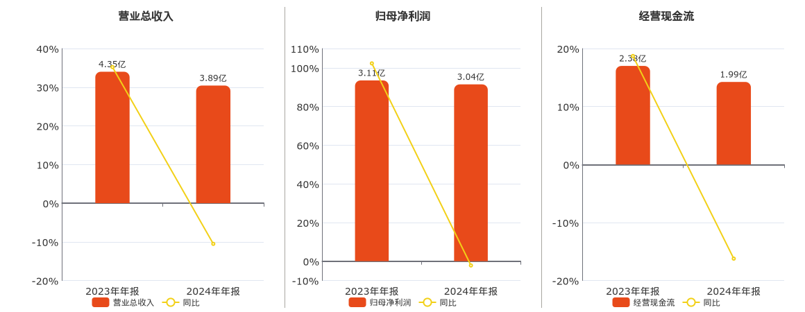 公司营业总收入为3.89亿元,较去年同报告期营业总收入减少4568.63万元,同比较去年同期下降10.51%。归母净利润为3.04亿元,较去年同报告期归母净利润减少677.42万元,同比较去年同期下降2.18%。经营活动现金净流入为1.99亿元,较去年同报告期经营活动现金净流入减少3861.66万元,同比较去年同期下降16.22%。