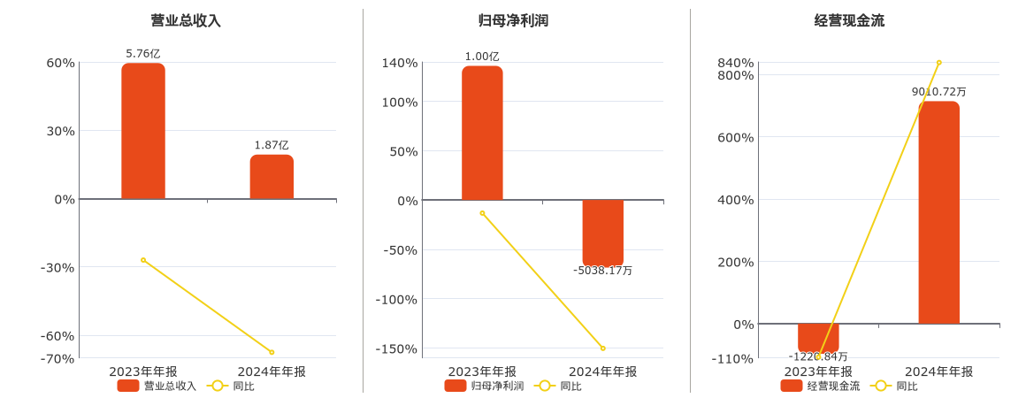 公司营业总收入为1.87亿元,较去年同报告期营业总收入减少3.89亿元,同比较去年同期下降67.56%。归母净利润为-5038.17万元,较去年同报告期归母净利润减少1.50亿元,同比较去年同期下降150.36%。经营活动现金净流入为9010.72万元。