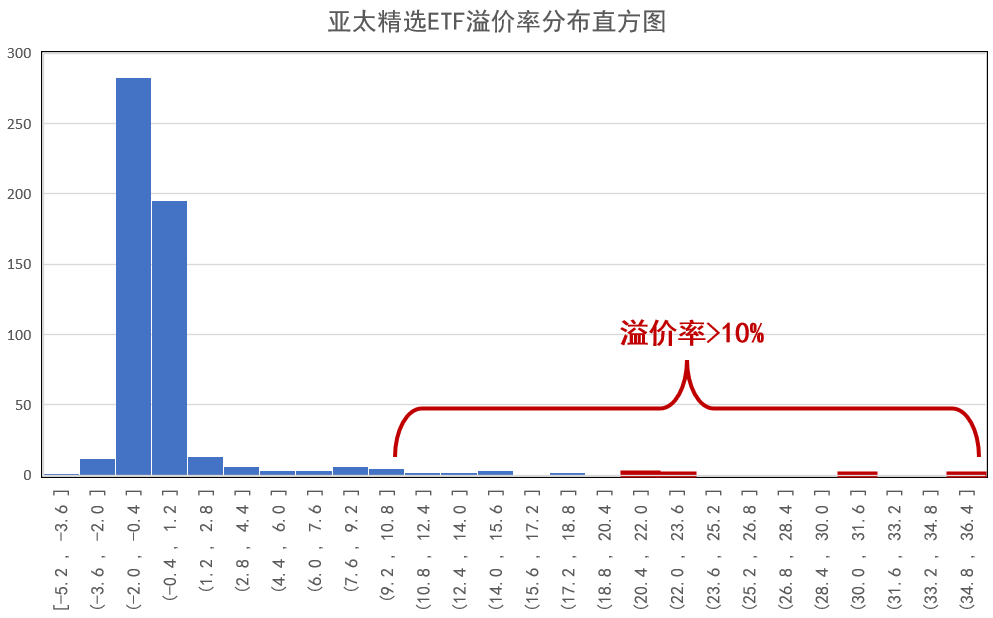 从亚太精选ETF的溢价分布(上图)可以看出,异常高溢价出现的频率很小,且明显分布在右侧(只有异常高溢价的情况,没有异常高折价的情况)。基于这一特征,有投资者会在平价或折价时买入,出现高溢价时再卖出获利。这一策略看似有效,但在卖出时点的把握上存在一定难度。高溢价出现的时间不易预判,很难捕捉;且由于产品规模较小,流动性不足,卖出时可能遇到困难。