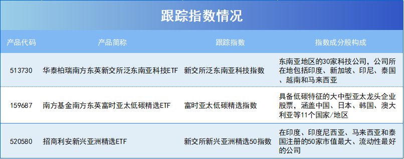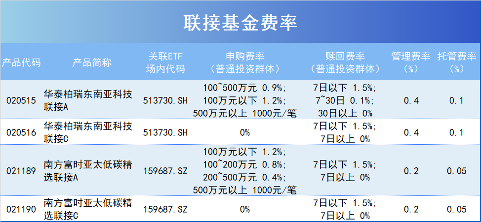 另外,华泰柏瑞南方东英新交所泛东南亚科技ETF(513730)和南方基金南方东英富时亚太低碳精选ETF(159687)还设立联接基金,场外市场投资者可以通过联接基金投资于关联ETF。