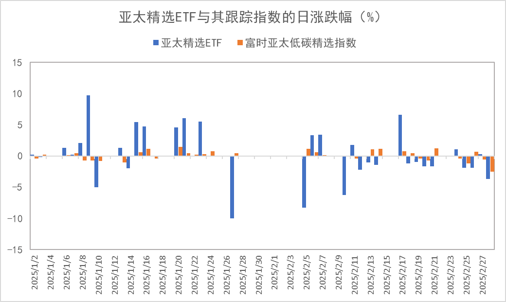 同样投资于亚洲新兴市场的南方基金南方东英富时亚太低碳精选ETF(159687,以下简称“亚太精选ETF”)偏离程度更大。2025年1月27日,亚太精选ETF跌停,而其跟踪的富时亚太低碳精选指数当日收盘上涨0.42%。