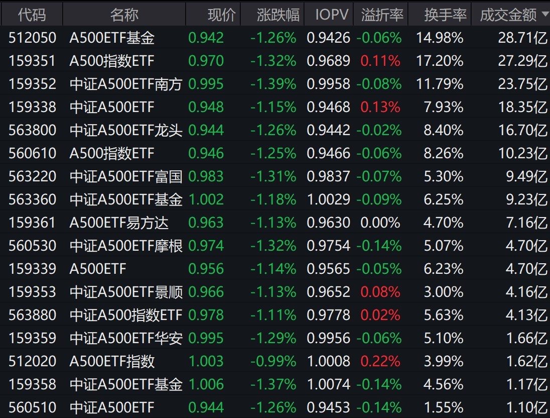 截至上午收盘,场内29只跟踪中证A500指数的ETF跌约1%,其中有17只中证A500相关ETF成交额超1亿元,6只超10亿元,A500ETF基金、A500指数ETF、中证A500ETF南方早盘成交额分别为28.71亿元、27.29亿元、23.75亿元。