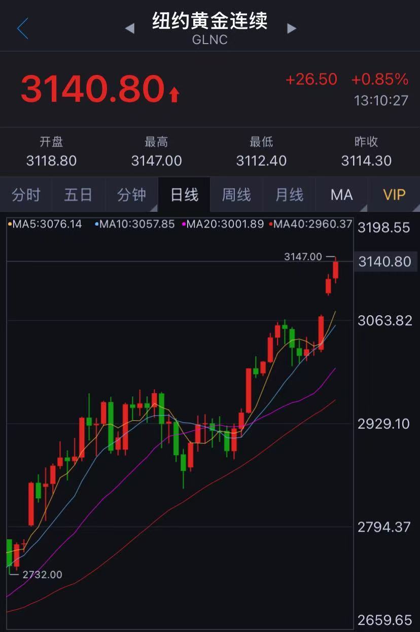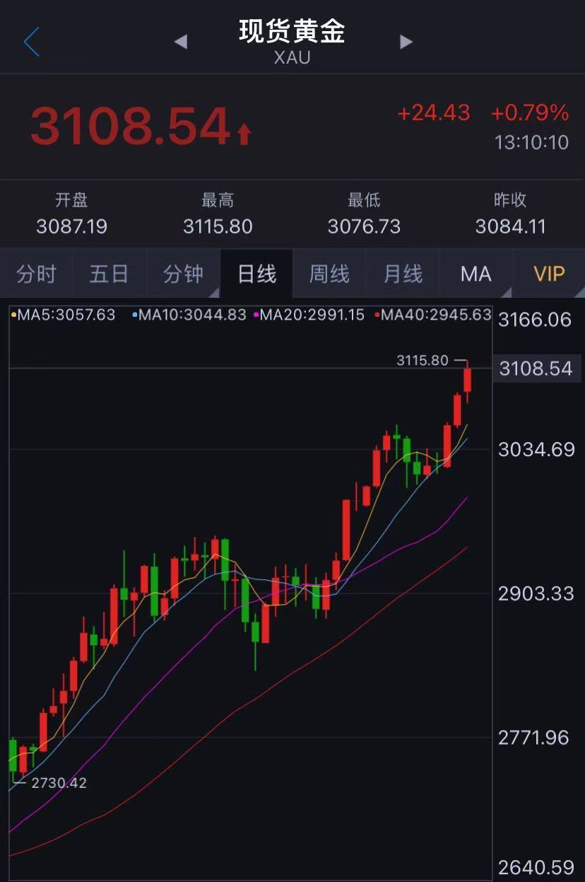 截至发稿,现货黄金日内涨幅达0.79%,至3108.54美元/盎司;COMEX期金日内涨超0.85%,现报3140.80美元/盎司。
