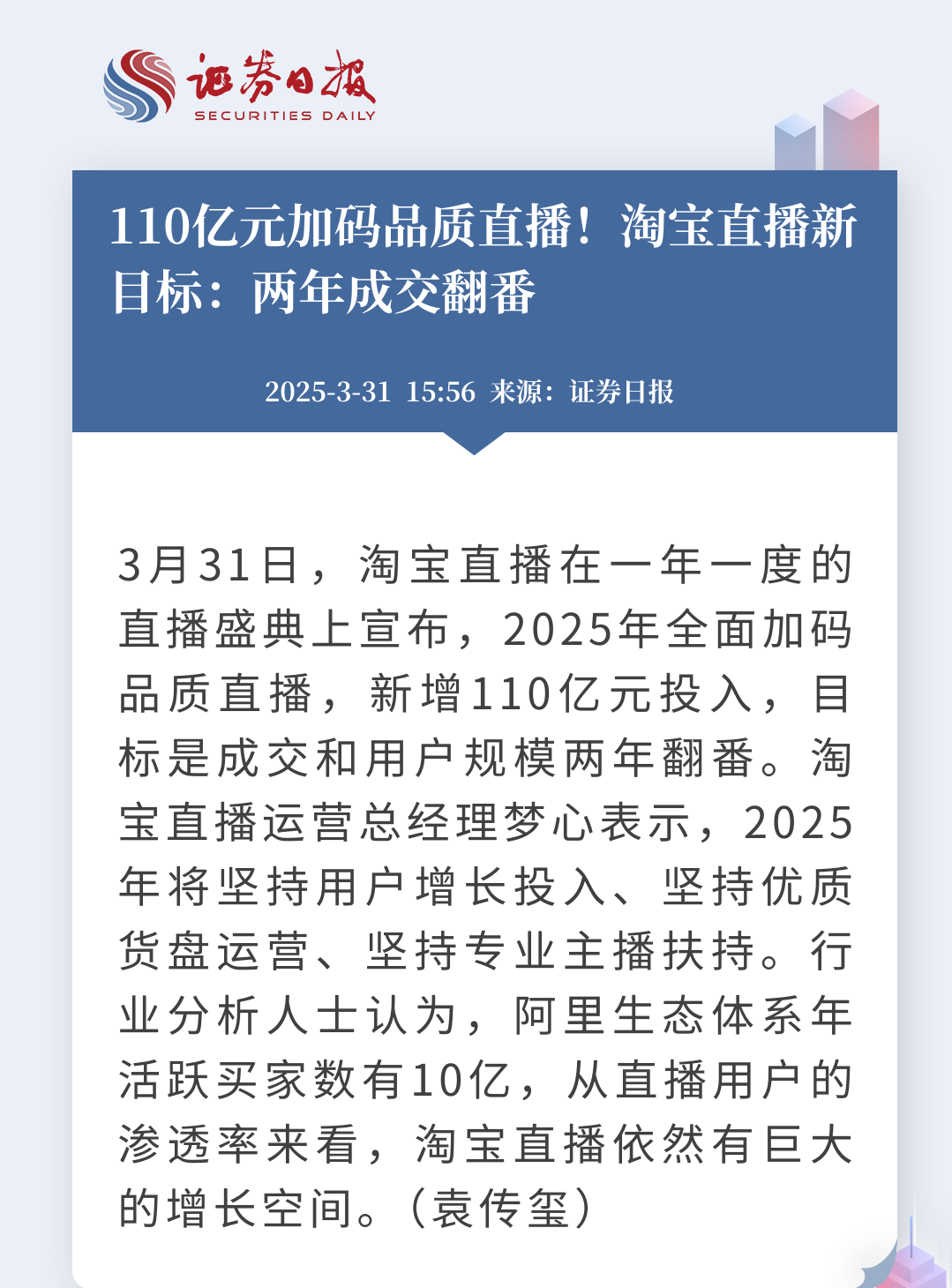 3月31日,淘宝直播在一年一度的直播盛典上宣布,2025年全面加码品质直播,新增110亿元投入,目标是成交和用户规模两年翻番。淘宝直播运营总经理梦心表示,2025年将坚持用户增长投入、坚持优质货盘运营、坚持专业主播扶持。行业分析人士认为,阿里生态体系年活跃买家数有10亿,从直播用户的渗透率来看,淘宝直播依然有巨大的增长空间。(袁传玺)