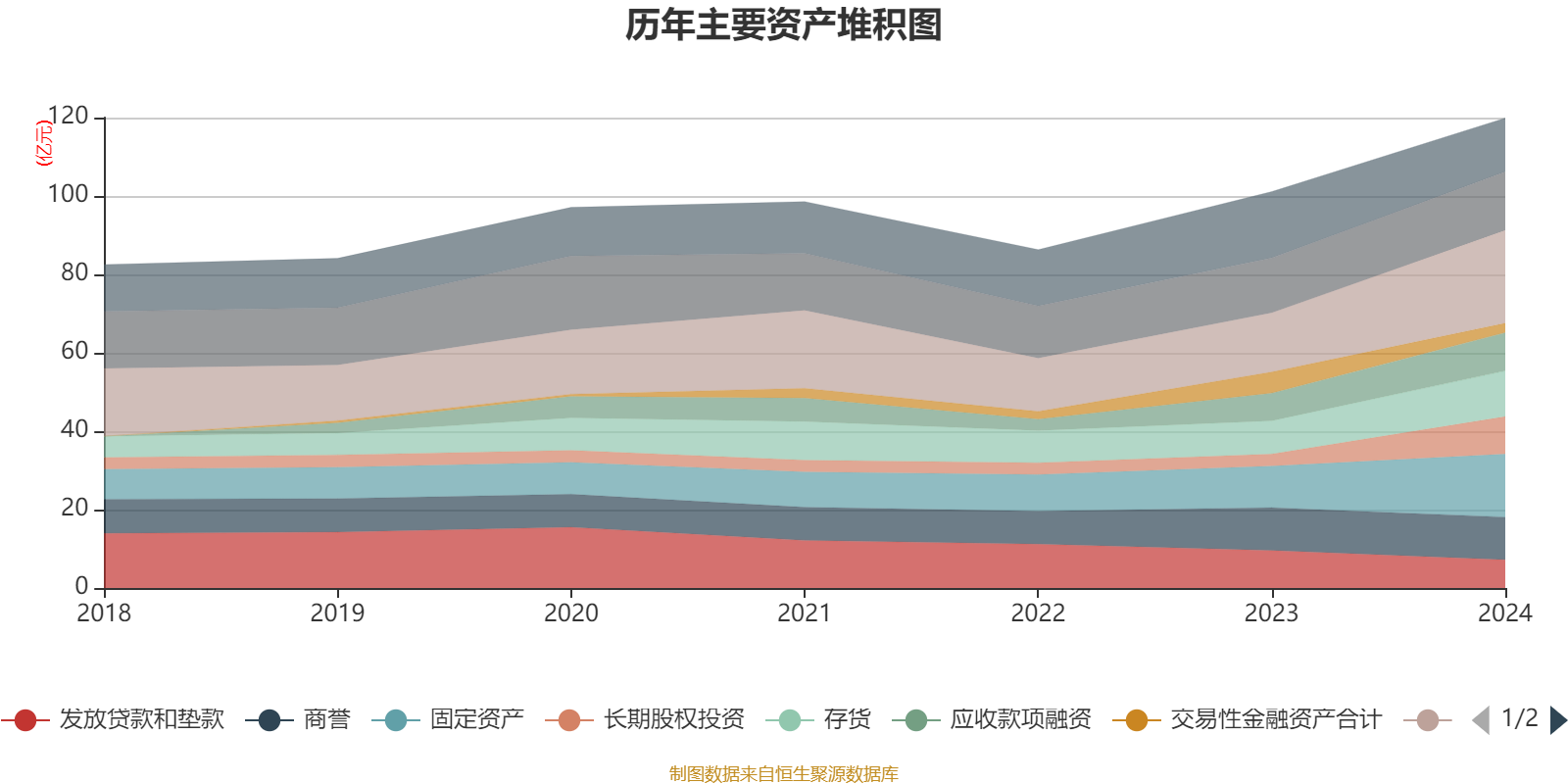 资产重大变化方面,截至2024年末,公司长期股权投资较上年末增加209.57%,占公司总资产比重上升4.92个百分点;应收票据及应收账款较上年末增加56.5%,占公司总资产比重上升4.78个百分点;在建工程合计较上年末减少76.61%,占公司总资产比重下降3.54个百分点;发放贷款和垫款较上年末减少25.11%,占公司总资产比重下降3.49个百分点。