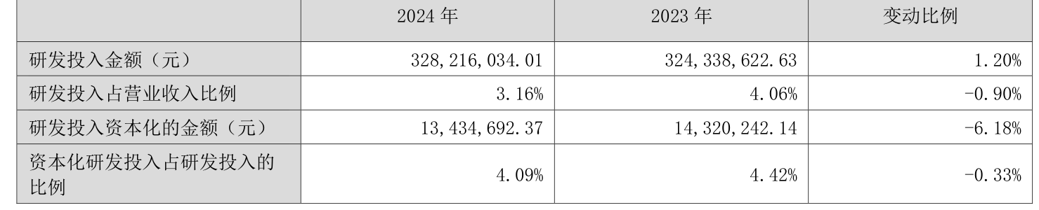 2024年全年,公司研发投入金额为3.28亿元,同比增长1.2%;研发投入占营业收入比例为3.16%,相比上年同期下降0.9个百分点。此外,公司全年研发投入资本化率为4.09%。