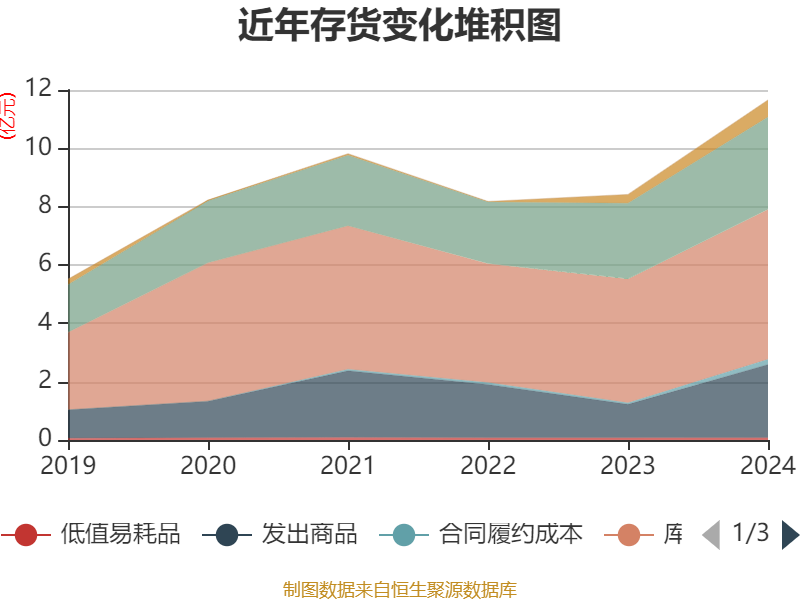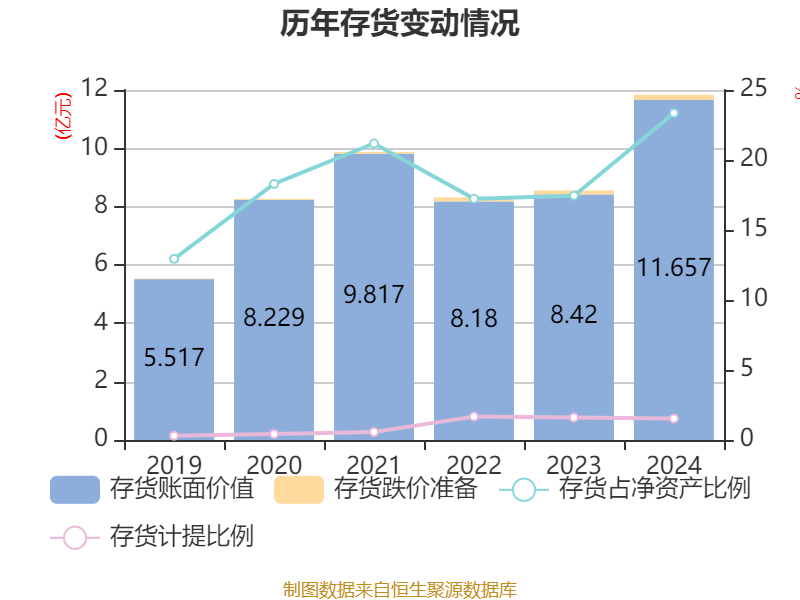 从存货变动来看,截至2024年末,公司存货账面价值为11.66亿元,占净资产的23.36%,较上年末增加3.24亿元。其中,存货跌价准备为1806.46万元,计提比例为1.53%。