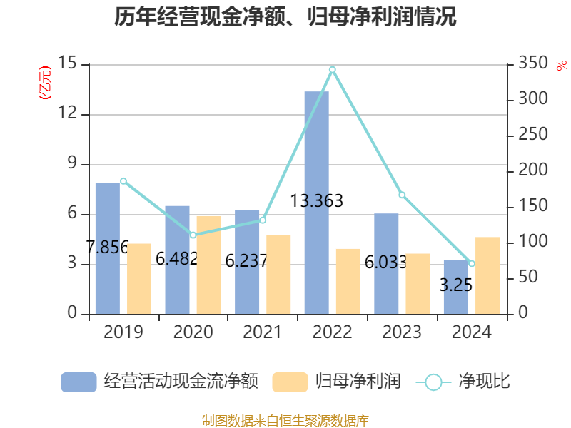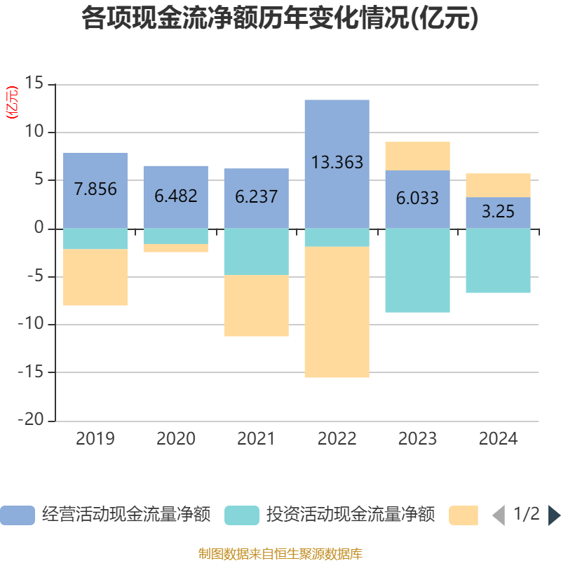 截至2024年,公司经营活动现金流净额为3.25亿元,同比下降46.14%;筹资活动现金流净额2.47亿元,同比减少5070.92万元;投资活动现金流净额-6.7亿元,上年同期为-8.74亿元。