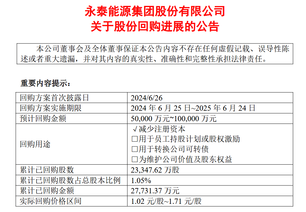 3月31日晚间,永泰能源(600157.SH)发布公告,截至2025年3月31日,公司累计回购2.33亿股,占总股本的1.05%,回购资金总额为2.77亿元,回购价格区间在1.02元/股至1.71元/股。