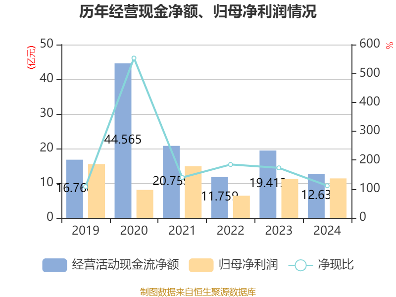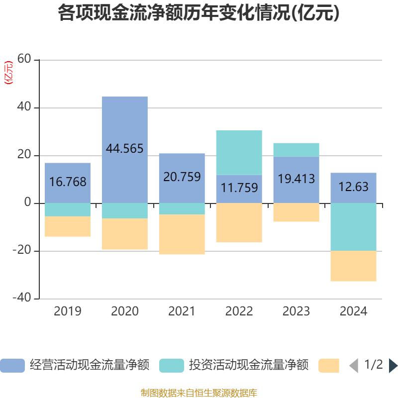 截至2024年,公司经营活动现金流净额为12.63亿元,同比下降34.94%;筹资活动现金流净额-12.8亿元,同比减少4.97亿元;投资活动现金流净额-20.02亿元,上年同期为5.66亿元。