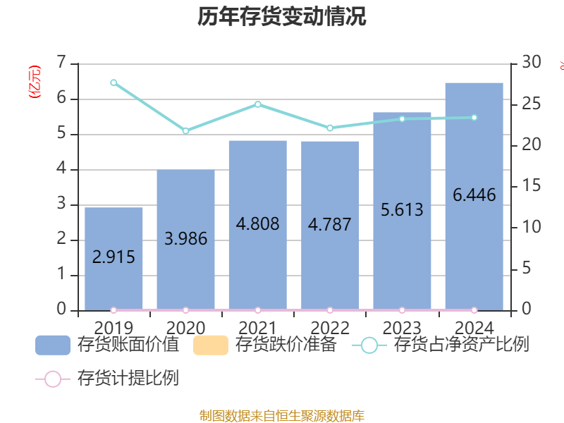 从存货变动来看,截至2024年末,公司存货账面价值为6.45亿元,占净资产的23.43%,较上年末增加8333.72万元。公司本期没有计提存货跌价准备。