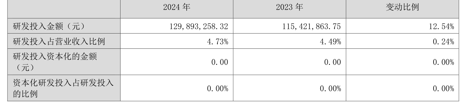 2024年全年,公司研发投入金额为1.3亿元,同比增长12.54%;研发投入占营业收入比例为4.73%,相比上年同期上升0.24个百分点。此外,公司全年研发投入资本化率为0%。