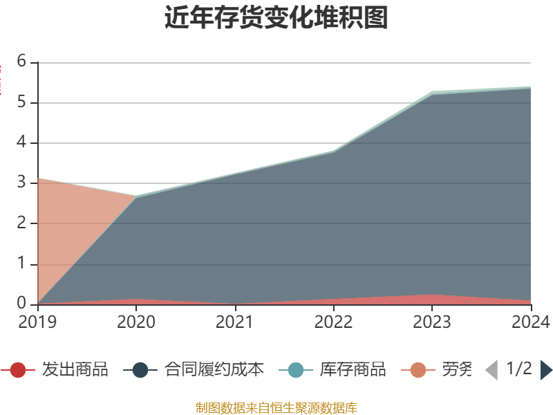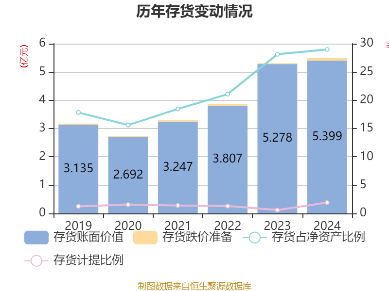 从存货变动来看,截至2024年末,公司存货账面价值为5.4亿元,占净资产的28.97%,较上年末增加1206.24万元。其中,存货跌价准备为1043.02万元,计提比例为1.9%。