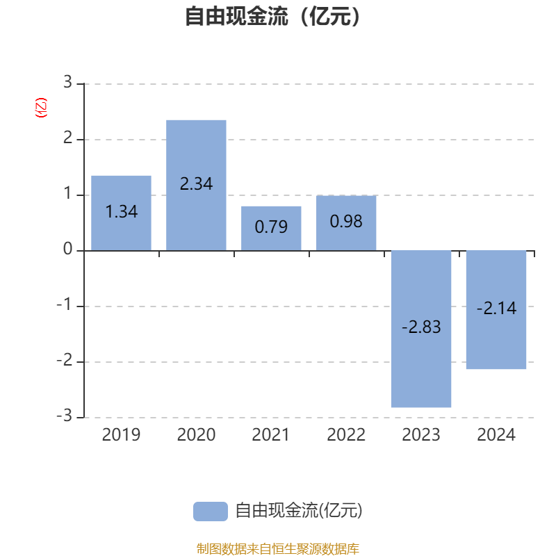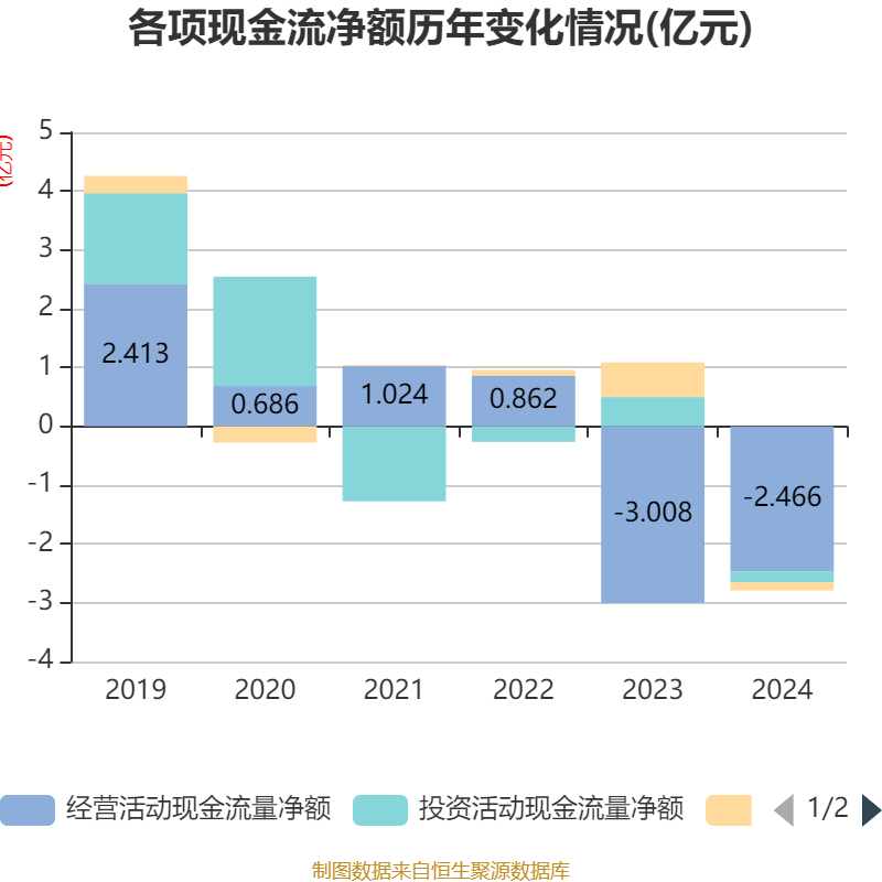 截至2024年,公司经营活动现金流净额为-2.47亿元,同比增加5419.1万元;筹资活动现金流净额-1417.73万元,同比减少7293.35万元;投资活动现金流净额-1849.85万元,上年同期为4983.55万元。