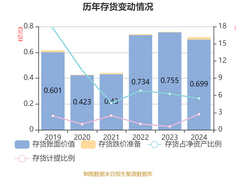 从存货变动来看,截至2024年末,公司存货账面价值为6986.59万元,占净资产的5.47%,较上年末减少566.64万元。其中,存货跌价准备为194.84万元,计提比例为2.71%。