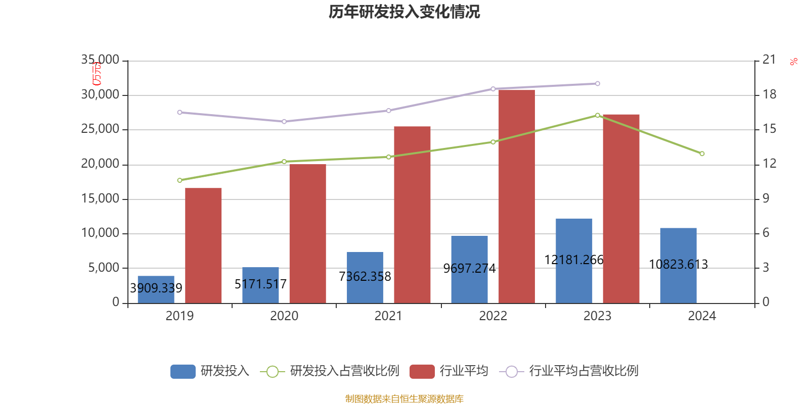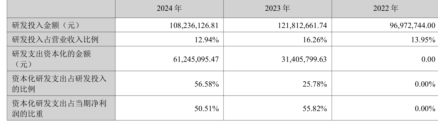 2024年全年,公司研发投入金额为1.08亿元,同比下降11.15%;研发投入占营业收入比例为12.94%,相比上年同期下降3.32个百分点。此外,公司全年研发投入资本化率为56.58%。