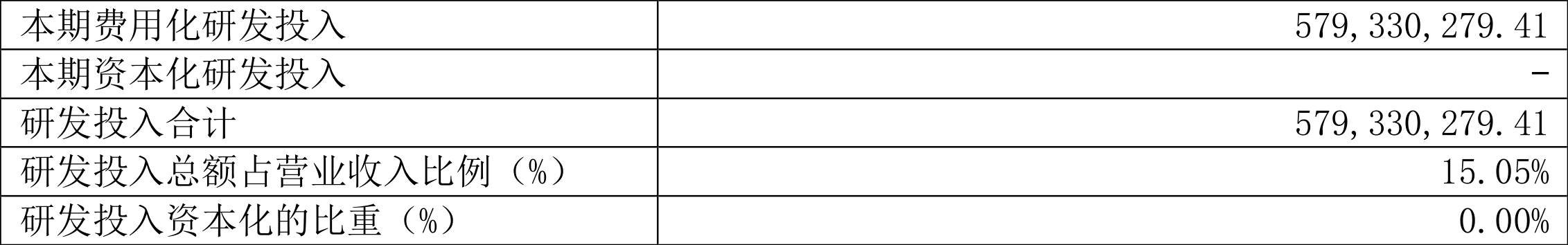 2024年全年,公司研发投入金额为5.79亿元,同比增长34.73%;研发投入占营业收入比例为15.05%,相比上年同期上升5.53个百分点。此外,公司全年研发投入资本化率为0%。