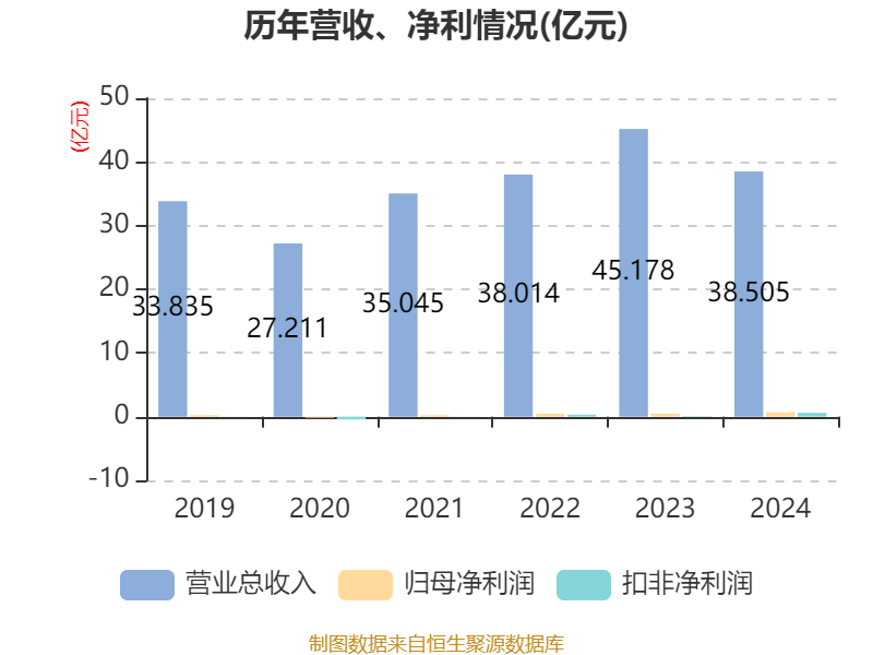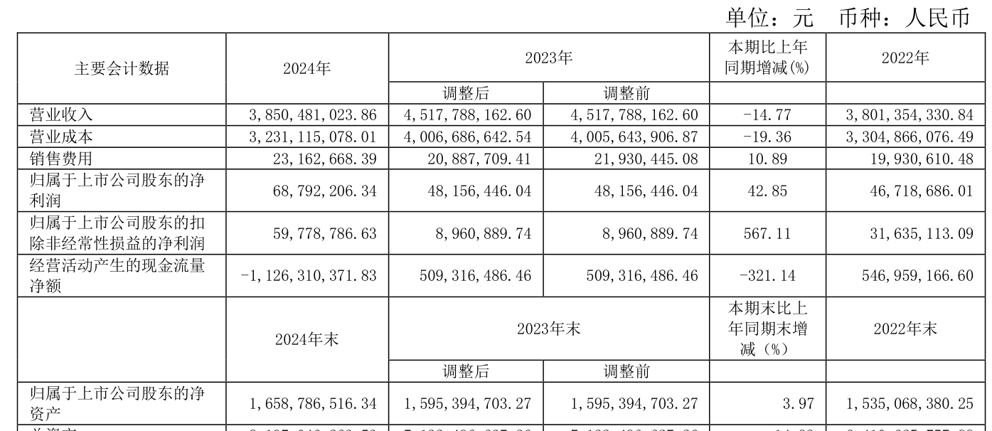 中证智能财讯航发科技(600391)4月1日披露2024年年度报告。2024年,公司实现营业总收入38.5亿元,同比下降14.77%;归母净利润6879.22万元,同比增长42.85%;扣非净利润5977.88万元,同比增长567.11%;经营活动产生的现金流量净额为-11.26亿元,上年同期为5.09亿元;报告期内,航发科技基本每股收益为0.21元,加权平均净资产收益率为4.23%。