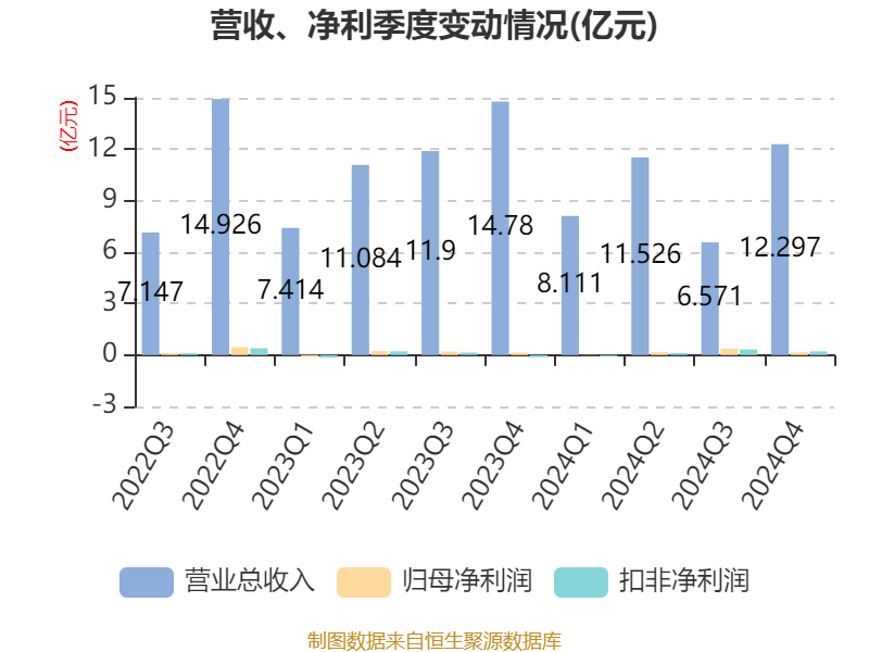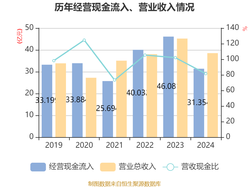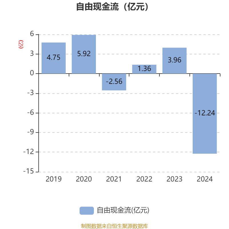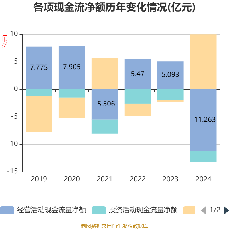 截至2024年,公司经营活动现金流净额为-11.26亿元,同比减少16.36亿元;筹资活动现金流净额9.99亿元,同比增加10.32亿元;投资活动现金流净额-1.94亿元,上年同期为-1.9亿元。