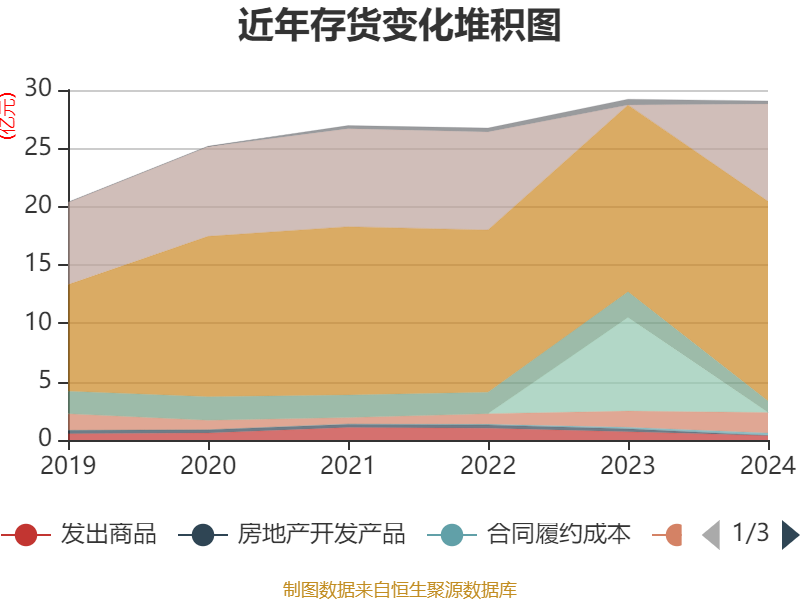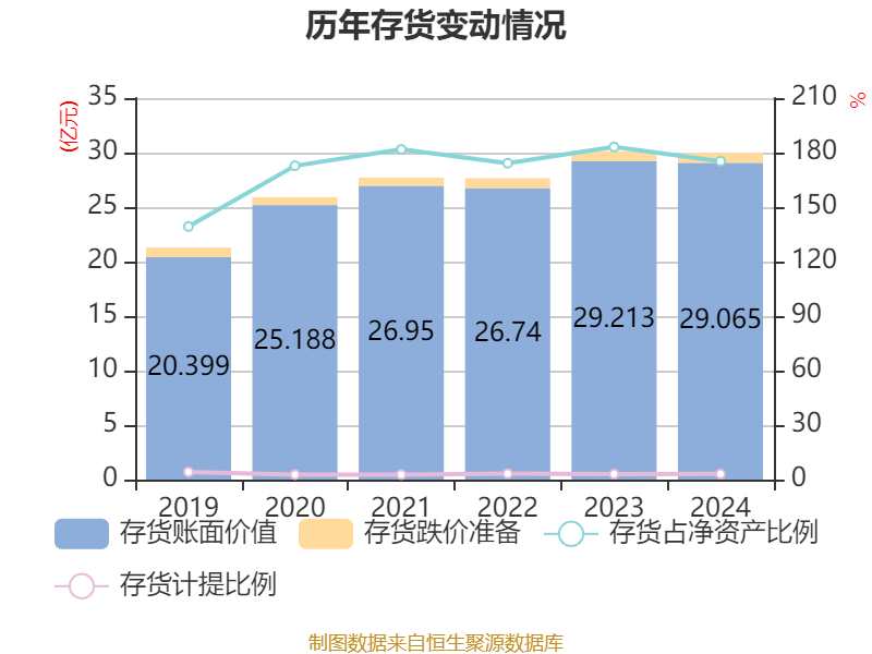 从存货变动来看,截至2024年末,公司存货账面价值为29.06亿元,占净资产的175.22%,较上年末减少1487.97万元。其中,存货跌价准备为9233.39万元,计提比例为3.08%。