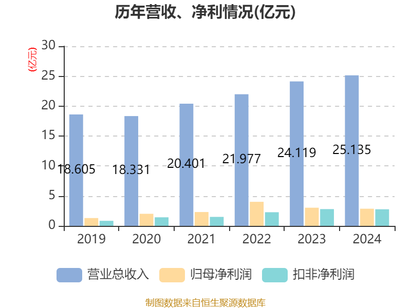 中证智能财讯应流股份(603308)4月1日披露2024年年度报告。2024年,公司实现营业总收入25.13亿元,同比增长4.21%;归母净利润2.86亿元,同比下降5.57%;扣非净利润2.77亿元,同比下降1.09%;经营活动产生的现金流量净额为9927.14万元,同比下降57.55%;报告期内,应流股份基本每股收益为0.42元,加权平均净资产收益率为6.33%。公司2024年度分配预案为:拟向全体股东每10股派现0.7元(含税)。