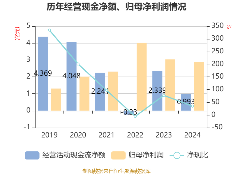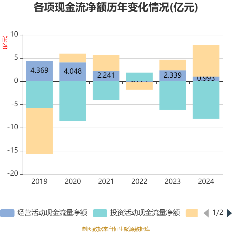 截至2024年,公司经营活动现金流净额为9927.14万元,同比下降57.55%;筹资活动现金流净额6.84亿元,同比增加4.55亿元;投资活动现金流净额-8.1亿元,上年同期为-6.18亿元。