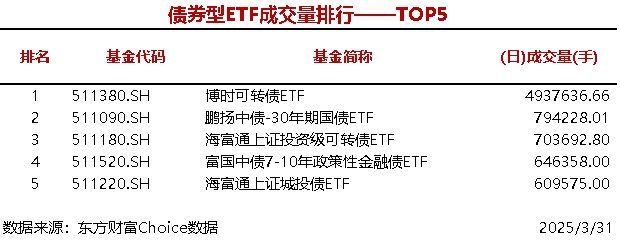 南方财经3月31日电,据东方财富Choice数据统计,今日共5只股票型ETF成交量超3000万手,华夏中证A500ETF成交5012.32万手,债券型ETF成交量最大的是博时可转债ETF(493.76万手),商品型ETF成交量最大的是华安黄金易ETF(674.69万手)。