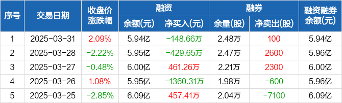 融资方面,当日融资买入7948.25万元,融资偿还8096.92万元,融资净偿还148.66万元。融券方面,融券卖出100股,融券偿还0股,融券余量2.48万股,融券余额71.42万元。融资融券余额合计5.94亿元。