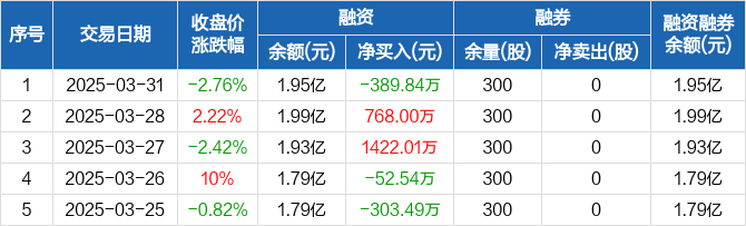 融资方面,当日融资买入3175.89万元,融资偿还3565.73万元,融资净偿还389.84万元。融券方面,融券卖出0股,融券偿还0股,融券余量300股,融券余额3489元。融资融券余额合计1.95亿元。