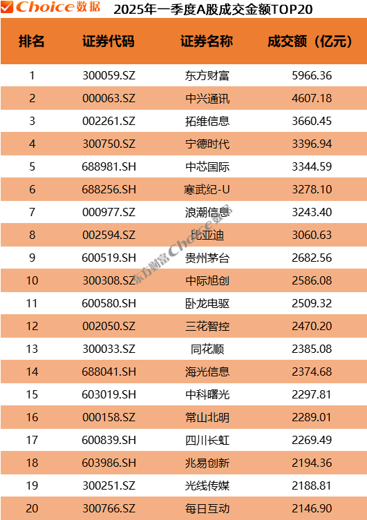 一季度,A股成交金额最大的个股是东方财富,累计成交5966.36亿元,中兴通讯位居次席,成交4607.18亿元,拓维信息、宁德时代、中芯国际、寒武纪、比亚迪成交金额超3000亿元。