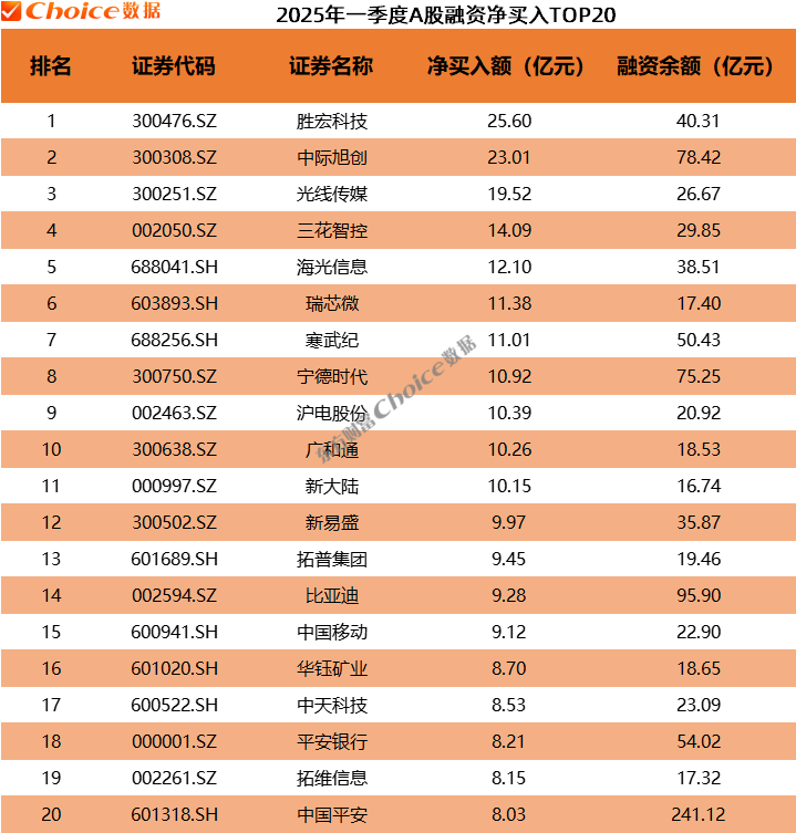 截至3月28日,共11只个股获融资资金净买入超10亿元,胜宏科技以25.6亿元的净买入额排名榜首,中际旭创、光线传媒排名第二、第三,分别净买入23.01亿元、19.52亿元。