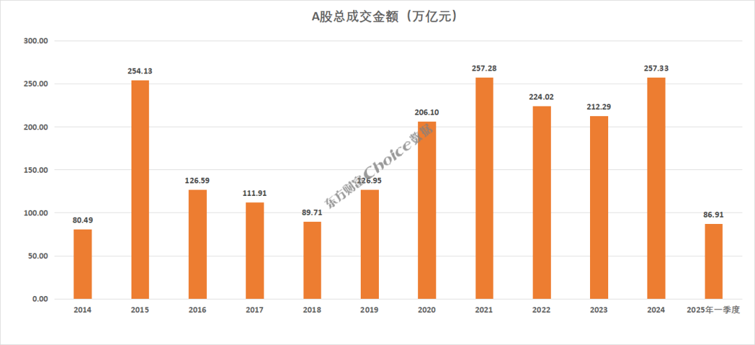 2025年一季度A股总成交金额近87万亿元,远超2024年同期的52万亿元。