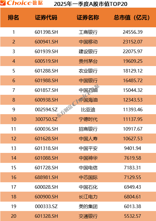截至一季度末,A股市场共12只个股总市值超过1万亿元,工商银行市值2.46万亿元,超过中国移动成为A股市值最大公司;中国移动、建设银行市值也都超过2万亿元,贵州茅台以1.96万亿元的市值位居第四;比亚迪、招商银行新晋为万亿市值公司。