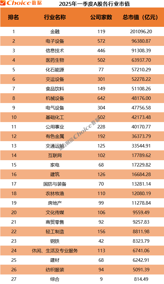 截至一季度末,A股市场市值最大的行业仍是金融,行业总市值超20万亿元,相比去年同期增加4.17万亿元;电子设备行业总市值9.64万亿元,位居第二,相比去年同期增加2.82万亿元;信息技术、化石能源、医药生物、交运设备、食品饮料行业总市值均在5万亿元以上。