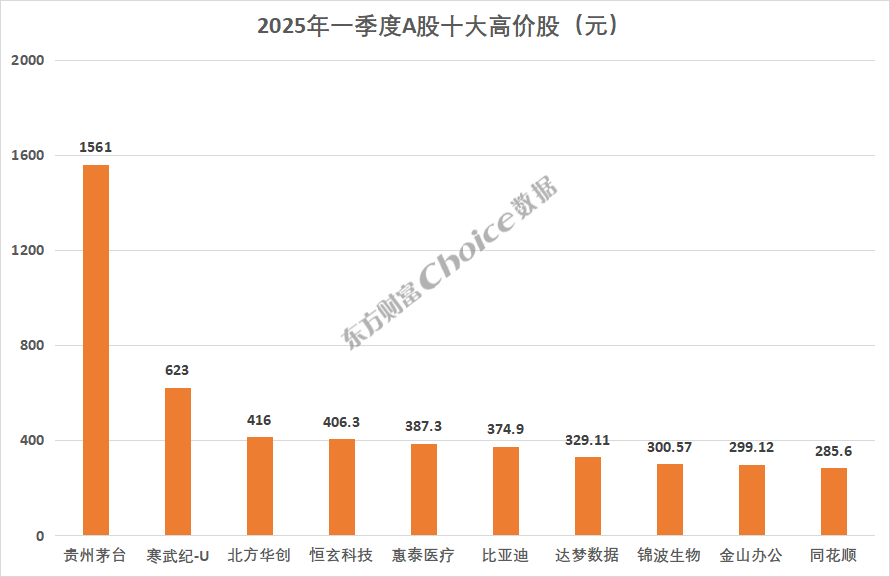 截至一季度末,贵州茅台股价1561元,仍是A股市场股价最高个股,寒武纪排名次席,股价高达623元。
