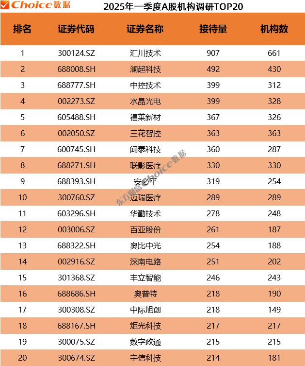 一季度,汇川技术荣登机构“调研冠军”宝座,机构调研总量907次,共661家机构参与调研;澜起科技、中控技术、水晶光电、福莱新材等获机构调研总量超过300次。