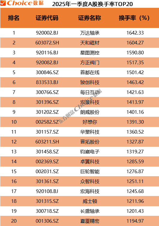 一季度,共5只个股换手率超过1500%,北交所个股万达轴承排名第一,换手率高达1642.33%。