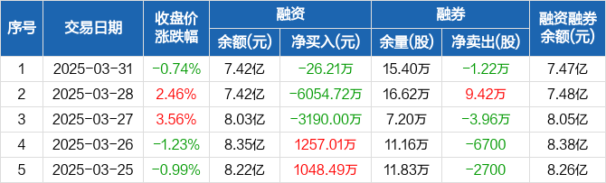 融资方面,当日融资买入3507.72万元,融资偿还3533.93万元,融资净偿还26.21万元,连续3日净偿还累计9270.92万元。融券方面,融券卖出1200股,融券偿还1.34万股,融券余量15.4万股,融券余额496.34万元。融资融券余额合计7.47亿元。