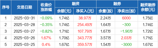 融资方面,当日融资买入1870.84万元,融资偿还1831.87万元,融资净买入38.97万元,连续6日净买入累计1168.04万元。融券方面,融券卖出8300股,融券偿还2300股,融券余量2.24万股,融券余额51.27万元。融资融券余额合计1.75亿元。