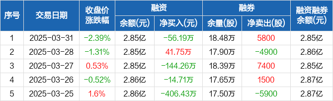 融资方面,当日融资买入417.88万元,融资偿还474.08万元,融资净偿还56.19万元。融券方面,融券卖出5900股,融券偿还100股,融券余量18.48万股,融券余额67.82万元。融资融券余额合计2.85亿元。