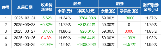 融资方面,当日融资买入6053.96万元,融资偿还9837.96万元,融资净偿还3784万元,连续9日净偿还累计2.28亿元。融券方面,融券卖出0股,融券偿还3000股,融券余量59万股,融券余额346.92万元。融资融券余额合计11.37亿元。
