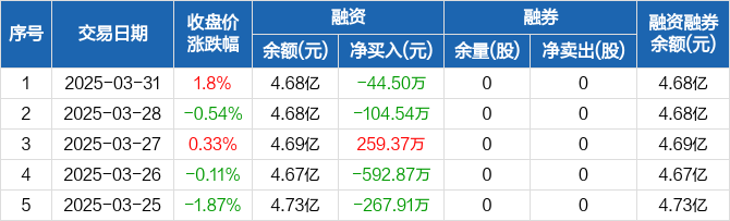 融资方面,当日融资买入2789.88万元,融资偿还2834.39万元,融资净偿还44.5万元。融券方面,融券卖出0股,融券偿还0股,融券余量0股,融券余额0元。融资融券余额合计4.68亿元。