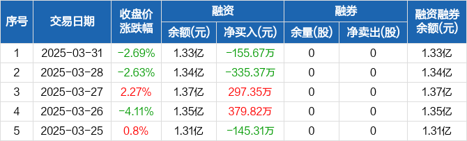 融资方面,当日融资买入1580.12万元,融资偿还1735.79万元,融资净偿还155.67万元。融券方面,融券卖出0股,融券偿还0股,融券余量0股,融券余额0元。融资融券余额合计1.33亿元。
