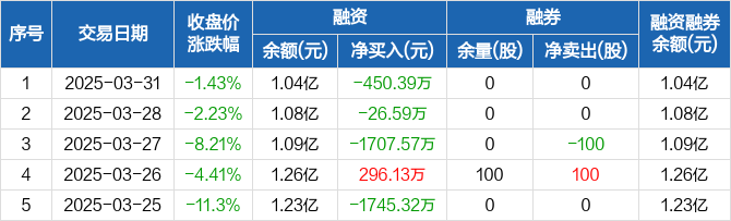 融资方面,当日融资买入1749.12万元,融资偿还2199.52万元,融资净偿还450.39万元,连续3日净偿还累计2184.56万元。融券方面,融券卖出0股,融券偿还0股,融券余量0股,融券余额0元。融资融券余额合计1.04亿元。