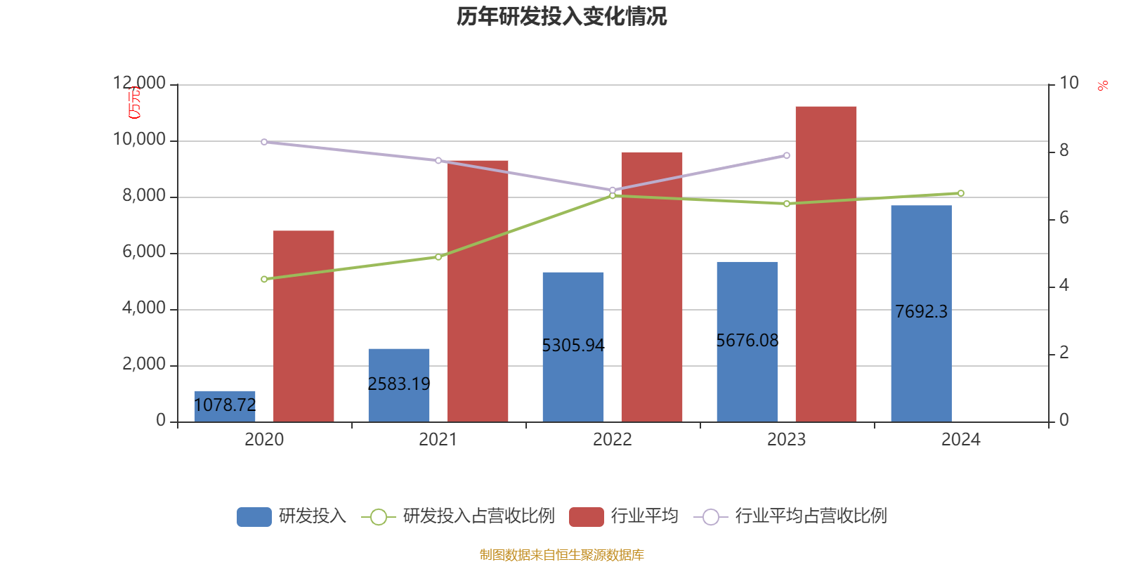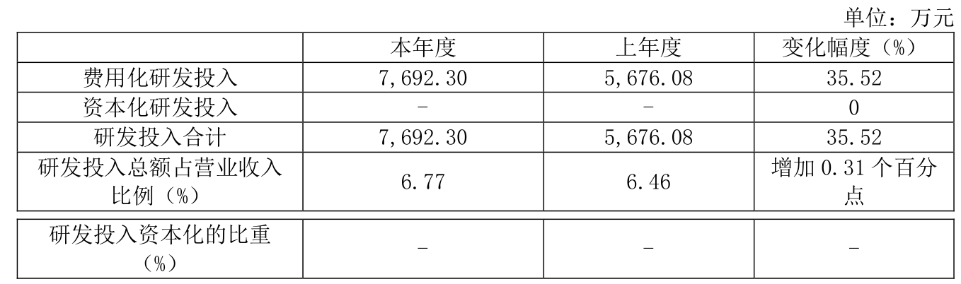 2024年全年,公司研发投入金额为7692.3万元,同比增长35.52%;研发投入占营业收入比例为6.77%,相比上年同期上升0.31个百分点。