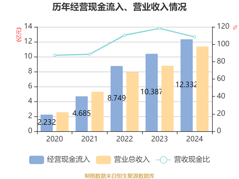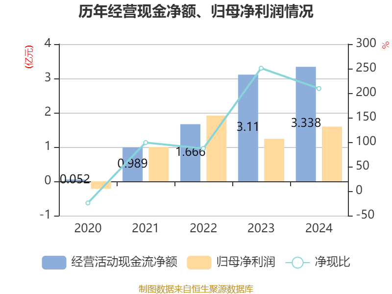 截至2024年,公司经营活动现金流净额为3.34亿元,同比增长7.35%;筹资活动现金流净额5156.09万元,同比减少282.37万元;投资活动现金流净额-4.33亿元,上年同期为-6.5亿元。