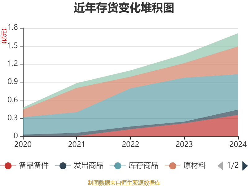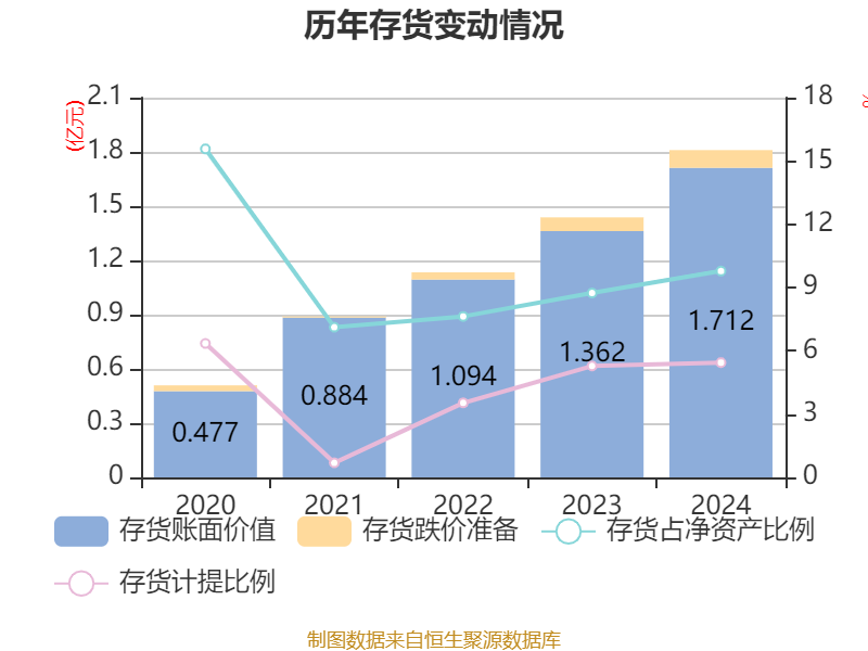 从存货变动来看,截至2024年末,公司存货账面价值为1.71亿元,占净资产的9.78%,较上年末增加3495.4万元。其中,存货跌价准备为984.79万元,计提比例为5.44%。